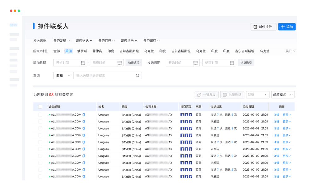 涵盖电话、邮箱、社媒等多渠道联系人信息,并顺利获得凯发K8云邮通及其他工具一键触达采购决策人,进行外贸找客户。